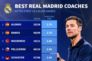 體育資訊10月27日訊 皇馬在本輪西甲焦點戰2-1力克巴薩,阿隆索帶隊延續了出色的戰績。德轉數據統計顯示,阿隆索執教皇馬的前10輪西甲拿分并列歷史第一。