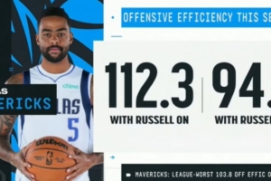 拉塞爾在場時獨行俠進攻效率112.3,下場后為94.7;目前獨行俠進攻效率103.8聯盟墊底