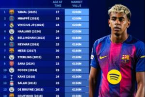 體育資訊10月29日訊 德轉盤點了歷史上身價最高的30名球員,歷史上共有四名球員達到過2億歐元里程碑,分別是亞馬爾(2025年,17歲)、姆巴佩(2018年,19歲)、維尼修斯(2024年,24歲)和哈蘭德(2024年,24歲)。