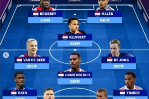 體育資訊10月30日訊 《轉會市場》統計了阿賈克斯現役青訓球員的巔峰身價情況,并列出一套最貴陣。