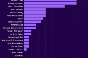 體育資訊10月31日訊 數據機構squakwa統計了本賽季曼城隊內的英超成功爭頂情況,哈蘭德和魯本-迪亞斯并列最多。