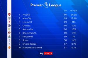 根據(jù)Opta目前的最新預(yù)測,如果阿森納及其爭冠對手繼續(xù)這樣踢下去,那么槍手只需70分即可奪冠。