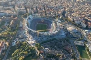 航拍圖像顯示,第三層看臺是改進(jìn)空間最大的部分。在第二層和第三層看臺之間將設(shè)置VIP包廂環(huán)廊,這是新諾坎普球場的重大亮點(diǎn)之一。