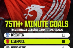 體育資訊10月31日訊 數據機構OPTA統計了英超球隊本賽季各項賽事在75分鐘后的進球情況,布萊頓力壓利物浦居首。