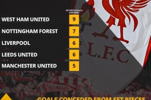 大難題!本賽季,英超中僅森林和西漢姆聯(lián)比利物浦定位球丟球更多