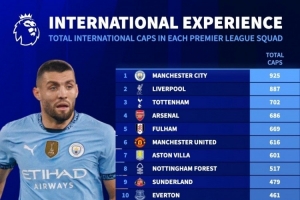 英超各隊球員國家隊出戰場次榜:曼城925場居首,利物浦887場次席