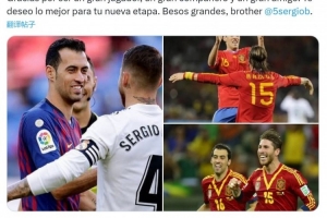 體育資訊9月26日訊 西班牙中場布斯克茨宣布賽季結束后退役,拉莫斯社媒發文,為他送上祝福。