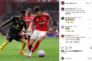 體育資訊11月2日訊 英超第10輪比賽,內科-威廉姆斯踢滿全場,幫助諾丁漢森林主場2-2戰平曼聯。