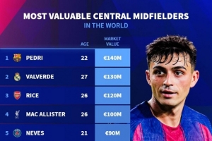 體育資訊11月2日訊 德國轉(zhuǎn)會(huì)市場(chǎng)列出了中場(chǎng)中路球員(Central Midfielders)身價(jià)排名,佩德里、巴爾韋德、賴斯前三。