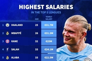 五大聯賽年薪排名:哈蘭德3170萬歐居首,姆巴佩、凱恩二三位