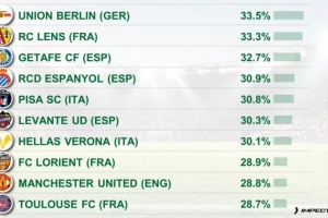 體育資訊11月4日訊 CIES統(tǒng)計了本賽季五大聯(lián)賽球隊攻防轉(zhuǎn)換階段占據(jù)進(jìn)攻總時間的比例,并列出榜單,柏林聯(lián)合由守轉(zhuǎn)攻占比33.5%居首,朗斯33.3%、赫塔費32.7%二三位。