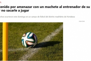 據馬德里高級警察總局通報,事件發生在本周日,位于馬德里奧爾塔萊薩區的一處足球場附近。被捕者與其兒子的足球教練發生激烈爭吵,多名目擊者向警方證實該男子曾手持砍刀作出暴力姿態。