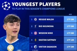 以下為歐冠各隊(duì)有望出戰(zhàn)比賽最年輕球員排行: