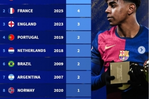 各國球員贏得金童獎次數排行:西班牙5次居首,法國4次位居第二