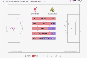 皇馬對陣利物浦的預期進球只有0.45,近一年來各項賽事最低