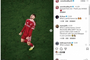 布拉德利當選本場比賽利物浦隊內最佳球員,賽后他在社交媒體上曬出照片,配文:“享受這場比賽,謝謝安菲爾德。”