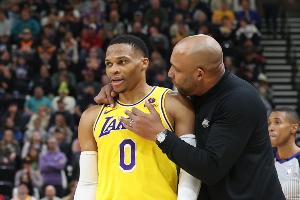 今日,湖人記者Harrison Faigen在個人社交媒體上發布了一張圖(如下),并配文:“只有一個人能執教拉文+莫蘭特+威少的后場。”