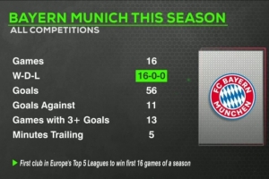 數據統計顯示,拜仁在本賽季各項賽事16戰保持全勝,打進56球、丟11球。有13場比賽能夠至少打進3球,本賽季共計僅有5分鐘處于落后。