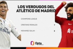 在歐冠賽場上,薩拉赫面對馬競打進3球僅次于C羅的7球
