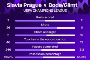 此役布拉格斯拉維亞射正11次,博德閃耀射正10次。據Squawka統計,這是近10個賽季第3場雙方都射正10+的歐冠比賽,前2場為2017年萊比錫vs貝西克塔斯、2020年薩爾茨堡vs拜仁。