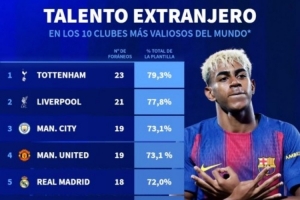 體育資訊9月18日訊 德國轉會市場統計了身價排名前十俱樂部的外籍球員占比,并列出榜單,在身價前十俱樂部之中,熱刺外援占比79.3%最高,巴薩43.5%最低。
