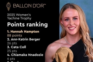 體育資訊9月28日訊 《法國足球》公布了2025年首屆女足雅辛獎的投票結果,英格蘭國家隊兼切爾西門將漢娜-漢普頓以壓倒性優勢歷史性地奪得該獎項。