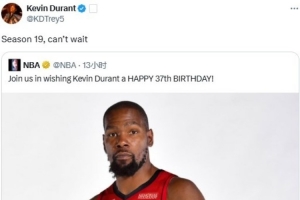 杜蘭特轉(zhuǎn)發(fā)官方生日祝福推文:迫不及待開啟生涯第19賽季了