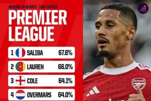 體育資訊10月1日訊 根據統計,在為阿森納出戰超過100場英超的球員中,薩利巴勝率最高,達到67.6%,這位法國中衛已與俱樂部續約至2030年。