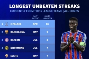 格拉斯納有能!五大聯賽當前不敗榜:水晶宮18場最多,巴薩9場第2