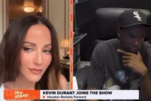 體育資訊10月1日訊 杜蘭特在連線時,和美女記者凱-亞當斯聊到,邀請對方來看火箭比賽,賽后還可以順便一起吃點小燒烤。