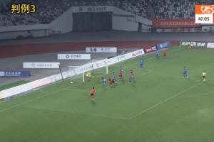判例三:中甲聯(lián)賽第24輪,蘇州東吳vs南京城市。比賽第48分鐘,蘇州東吳6號隊員頭球射門,南京城市守門員將球撲出,助理裁判員示意球的整體已經(jīng)越過球門線,裁判員判蘇州東吳隊進球得分。