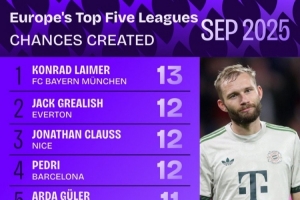 9月份五大聯賽創造機會榜:萊默爾第1,格拉利什第2,佩德里第4