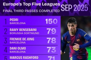 歐洲5大聯賽9月進攻3區成功傳球:佩德里150次第1,本塞拜尼79第2