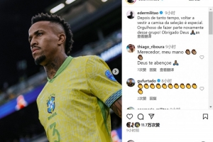 米利唐上次為巴西隊出戰要追溯到去年7月份,此后他因傷病長期缺席,米利唐更新社媒動態,表達了入選巴西隊名單的喜悅之情。