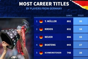 體育資訊10月2日訊 德國轉(zhuǎn)會(huì)市場(chǎng)統(tǒng)計(jì)了德國球員的冠軍數(shù)量,并列出榜單,隨溫哥華白浪贏得加拿大冠軍杯冠軍的穆勒以35冠居首,克羅斯34冠次席。