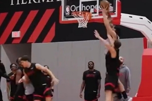 體育資訊10月3日訊 火箭官方曬出球隊訓練視頻,亞當斯與隊友配合后在申京頭上完成空接暴扣。