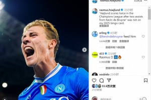 霍伊倫社媒曬出比賽照片,并寫道:“霍伊倫在歐冠比賽中梅開二度,還都是德布勞內的助攻——這完全不在我2025年的劇本之中。”
