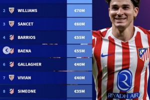 西甲非皇馬和巴薩球員身價前十:小蜘蛛1億歐第一,馬競6人上榜
