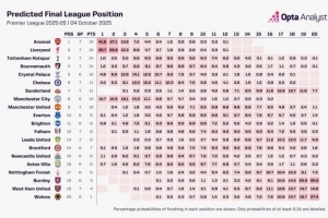 此役過后,數據機構OPTA超級計算機預測本賽季英超冠軍↓